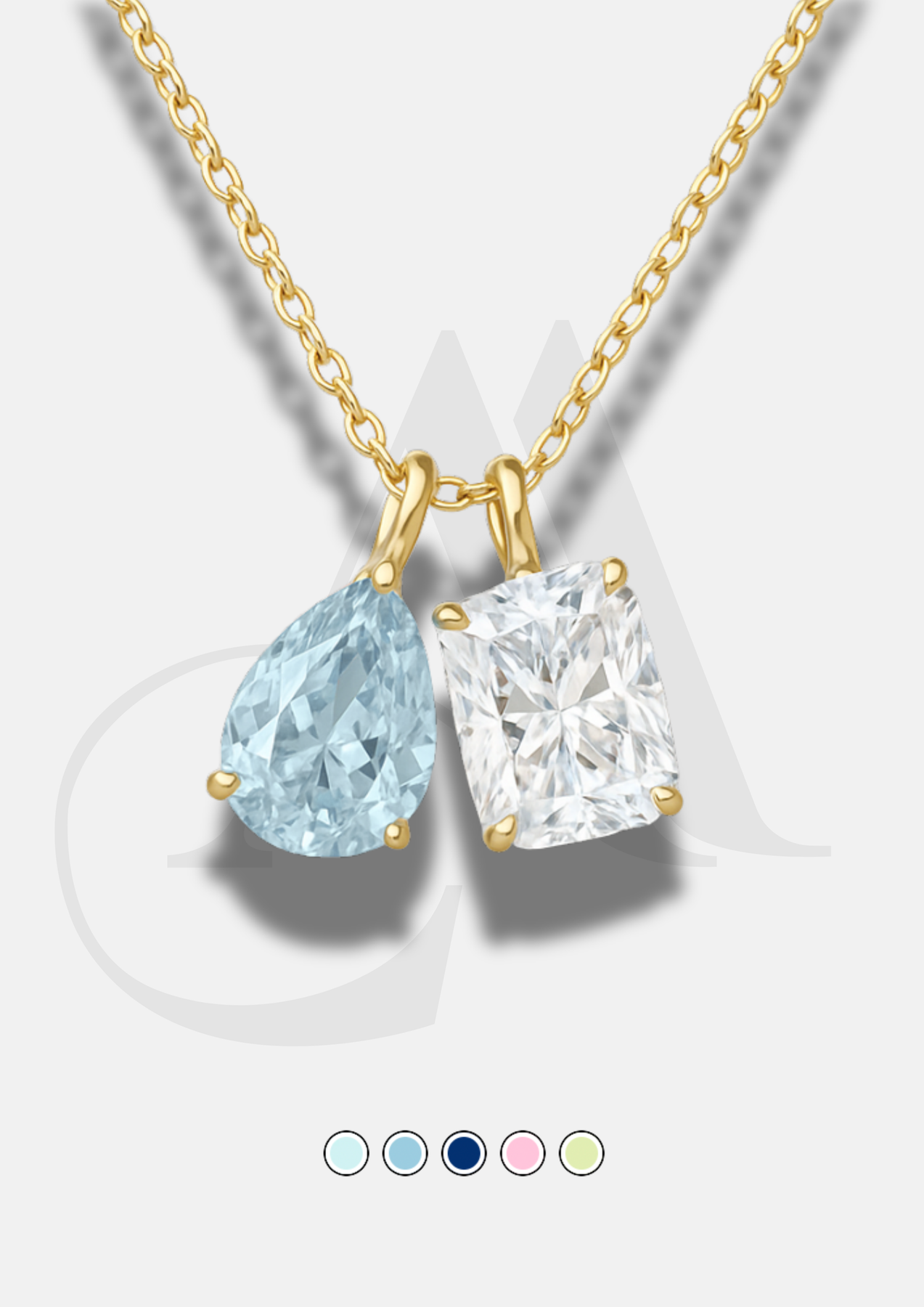 Presenting the "You & Me" Alara Birth Month Necklace, inspired by the timeless romance of Napoleon’s proposal to Empress Josephine. This exquisite two-stone pendant, featuring one pear-shaped and one elongated radiant gemstone, captures the essence of eternal love and partnership. Each stone is meticulously chosen to reflect the birth month colours of two special individuals, weaving their unique stories into a single, elegant design.
